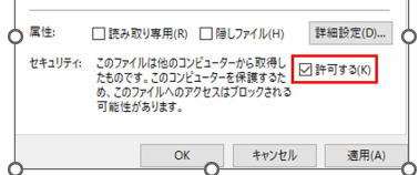 既にExcel図化.xlsmをダウンロード済の場合、そのファイルを右クリック→プロパティ→全般の一番下の許可するにチェックしてください。